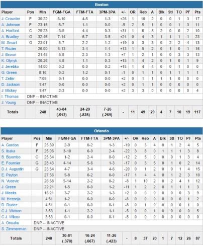 Menés d’un point à la mi-temps, les Celtics (avantage 49-37 au rebond) réalisent un gros 3ème quart-temps et se détachent dans le 4ème. Orlando, qui sortait d’un road trip à 4 victoires et 1 défaite, a été limité à 37% aux tirs et ses meilleurs scoreurs ne dépassent pas les 15 (D.J. Augustin) et 14 points (Evan Fournier). Le Magic prend jusqu’à 18 points de retard dans le 3ème quart alors que Boston (29 passes décisives contre 20 pour Orlando) creuse l’écart en multipliant les 3-points (après seulement 2 tirs longue distance réussis en 1ère mi-temps).