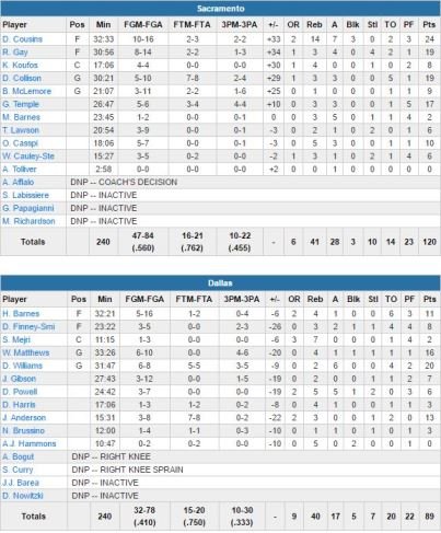 Sacramento termine bien son road trip de 6 matchs avec une victoire 120-89 à Dallas portée par 24 points à 10/16, 14 rebonds, 7 passes et 3 contres de DeMarcus Cousins (11ème double-double de la saison) et 19 points (8/14, 3 rebonds et 4 passes) de Rudy Gay.