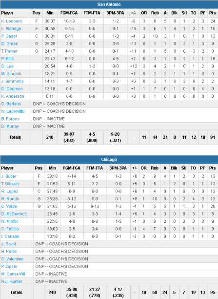 Malgré le retour de Tony Parker (8 points et 5 passes), les Texans ont connu une mauvais soirée, limités à 40.2% au tir, se retrouvant menés de 18 points en seconde mi-temps. Kawhi Leonard est le meilleur marqueur des siens avec 24 points à 10/19, 8 rebonds et 5 passes. Patty Mills ajoute 16 points à 6/12 et le duo d’intérieurs LaMarcus Aldridge – Pau Gasol combine seulement 23 points et 16 rebonds. Les Bulls ont su compenser leurs 19 ballons perdus avec un peu plus de réussite sous l’impulsion de Dwyane Wade (20 points à 5/13), Rajon Rondo (12 points, 12 rebonds et 9 passes) et Jimmy Butler. Ce dernier a connu une première mi-temps très mauvaise avec 1 point à 0/5 mais il s’est réveillé en seconde avec 13 points à 4/9.