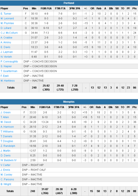 Impressionnants dans le money time depuis le début de saison, les Memphis Grizzlies ont encore remporté un match très accroché où ils ont fait leur retour dans le dernier quart pour s’imposer dans la dernière seconde sur 2 lancers de Toney Douglas suite à une faute de Damian Lillard. Ils battent les Blazers 88-86 pour leur 16ème victoire de la saison en 24 sorties, soit leur 5ème victoire consécutive. Ils ont remporté leurs 12 derniers matchs dans des rencontres qui sont allées en prolongation ou ont été décidées par 5 points ou moins.
