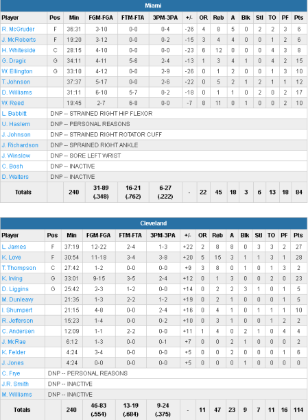Incertain avant la rencontre, Kevin Love ajoute 28 points à 11/18 dont 3/8 à 3-pts et 15 rebonds tandis que Kyrie Irving marque aussi plus de 20 points avec 23 unités. Les Cavaliers ont shooté à 55.4% sur la rencontre et perdu seulement 11 ballons, ne laissant aucune chance aux Floridiens, limités eux à 34.8% et avec seulement 8 joueurs en tenue. Derrick Williams est le meilleur marqueur avec 17 points alors que Goran Dragic en ajoute 15. Hassan Whiteside, qui a passé la majorité du 3ème quart sur le banc, compile seulement 8 points et 12 rebonds, Erik Spoelstra étant mécontent de ses efforts.