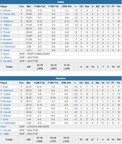 À noter : Harrison Barnes termine à 20 points à 7/13 et 4 rebonds, Deron Williams 9 points et 6 passes. Houston (16 paniers à 3-points, 23ème match consécutif à au moins 10 trois-points réussis) a marqué 60 points à la mi-temps. C’est la 13ème fois cette saison.