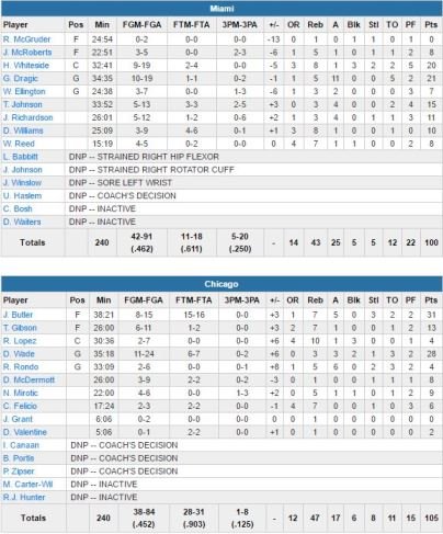 Johnson réduit l’écart à 97-96 sur un 3-points à 4’20. Butler enchaîne avec un and one converti (101-96) mais le Heat n’en avait pas terminé avec sa tentative de comeback. Dragic et Whiteside scorent tous les deux à l’intérieur pour revenir à 101-100 alors qu’il ne reste que 13 secondes. Butler rentre alors 2 lancers-francs pour le +3 de Chicago. Avec un ballon pour égaliser dans les mains, Dragic et Josh Richardson ratent leur connexion en tête de raquette et Butler intercepte pour obtenir 2 lancers supplémentaires de l’autre côté et à moins d’une seconde la fin.