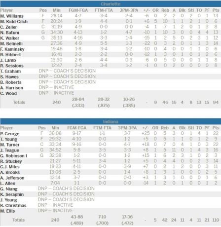 Côté Hornets ça ne monte pas très haut au niveau du scoring puisque Marco Belinelli est meilleur scoreur de l’équipe avec 14 points, suivi de Marvin Williams et Nicolas Batum avec 13 points puis de Kemba Walker avec 12 unités. Charlotte n’a shooté qu’à 33.3% sur le match. Turner et Glenn Robinson III rentrent chacun un 3-points en début de match pour aider Indiana à prendre un bon départ.