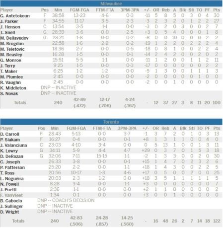 Les Raptors shootent à 50.6% et 56% à 3-points (14/25) alors que Milwaukee (qui encaisse 30 points ou plus dans 3 des 4 quarts-temps du match) ses 13 premières tentatives à 3-points pour finir à 16.7% derrière l’arc (4/24) et 47.2% au général.