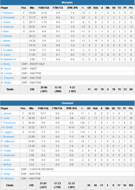 En l’absence de Kyrie Irving, mis aussi au repos, les Cavaliers se sont appuyés sur Kevin Love (29 points à 6/17 et 13 rebonds), LeBron James (23 points à 9/17, 6 rebonds et 8 passes) et Jr Smith. Ce dernier a retrouvé un temps son adresse, en première mi-temps pour donner un coup de main à ses deux acolytes avec 23 points (17 avant la pause) à 6/10 derrière l’arc. Sans Marc Gasol les Grizzlies ont eu du mal et sont limités à 40.7% au tir dont un 4/22 à 3-pts en plus de 15 ballons perdus. Zach Randolph, titulaire, compile 18 points et 5 passes mais seuls deux autres joueurs atteignent les 10 points; Troy Williams et Andrew Harrison avec 13 chacun.