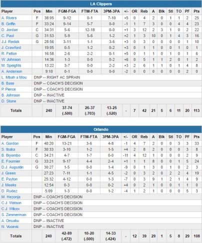 Blake Griffin (23 points à 9/14, 7 rebonds et 3 passes), DeAndre Jordan (22 points à 5/6 et 12/16 aux lancers-francs, 12 rebonds et 3 contres) et Chris Paul (16 points à 5/9 et 10 passes) sont appliqués alors qu’en face, c’est Aaron Gordon qui sort du lot avec 33 points à 13/21 et 4/8 à 3-points et 7 rebonds. Evan Fournier ajoute 24 points (9/17, 8 passes), Jeff Green 19 (7/11).
