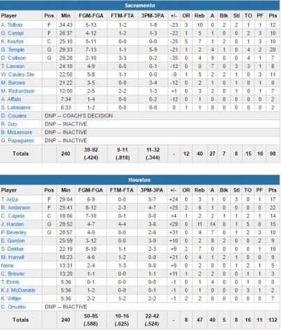Pour leur défense, les Kings jouaient sans Rudy Gay (hanche), Ben McLemore (quadriceps) et DeMarcus Cousins (repos). Ça faisait forcément un peu beaucoup… Garrett Temple termine meilleur marqueur de son équipe avec 20 points (7/13, 4 passes). Aux côtés d’Harden, on retrouve Ryan Anderson (22 points à 8/12, 6 rebonds) et Sam Dekker, qui bat son record en carrière avec 19 points (8/10, 7 rebonds).