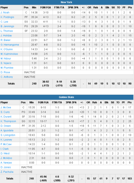 Bien sûr dans ces conditions il n’y a pas eu de match et les visiteurs n’ont tenu que 4 minutes. Sans écraser la rencontre Golden State menait 32-25 après 12 minutes mais malgré une adresse moyenne, leur jeu collectif a fait la différence et l’écart s’est creusé petit à petit. A la pause ils menaient 59-45 mais n’ont jamais laissé New York espérer avec un excellent 3ème acte où ils ont pris 25 points d’avance suite à 14-0. Après 3 quarts l’affaire était pliée, 88-66.