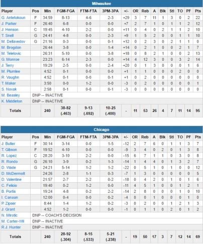 Déjà vainqueurs des Bulls à Milwaukee jeudi (108-97), les Bucks (46.3% de réussite contre 30.4%) ont récidivé et cette fois Chicago n’a offert aucune résistance, s’inclinant 95-69 au United Center. Giannis Antetokounmpo est l’homme du match avec 22 points à 8/13, 7 rebonds, 11 passes et 3 interceptions mais 5 autres de ses coéquipiers marquent au moins 10 points dans ce match, dont Greg Monroe et ses 14 points et 12 rebonds.