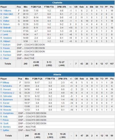 Charlotte avait de son côté bien besoin d’une victoire pour terminer son road trip de 5 matchs. Les Hornets démarrent par un 4/16 dans le 1er quart mais passe ensuite un 30-10 à leurs adversaires pour prendre 12 points d’avance. Atlanta répond par un 13-1 pour recoller à 4 points en milieu de 3ème quart. Hardaway Jr aux lancers-francs permet même aux siens de passer devant à 7’41 (87-86) pour le premier avantage de son équipe depuis la première minute de jeu dans le match. L’avantage tient quelques minutes (95-94 sur un jump shot de Millsap à 3’51) mais re-bascule définitivement en faveur des Hornets sur un layup de Belinelli. Charlotte boucle sa période avec 5 points d’avance grâce à un 3-points de Williams à 27.8 secondes.