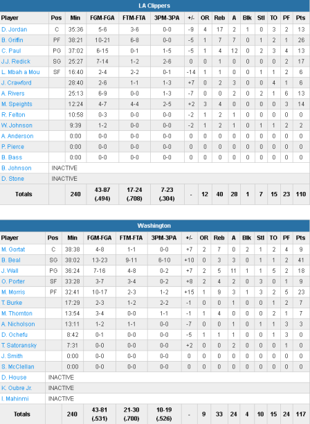 Bradley Beal a été le grand artisan de la victoire des siens puisqu’il les a maintenus en vie dans le troisième acte. Il termine avec 41 points à 13/23 dont 6/10 à 3-pt. Markieff Morris a lui été décisif dans le money time et il signe 23 points à 10/17, 9 rebonds, 3 passes et 3 interceptions. John Wall ajoute 18 points, 5 rebonds et 11 passes. En face les Clippers ont craqué dans le money time et le duo Chris Paul – Blake Griffin n’a pas répondu présent dans ces dernières minutes. Griffin compile 26 points à 10/21, 7 rebonds et 7 passes alors que Chris Paul ajoute 13 points et 12 passes. DeAndre Jordan est en double-double avec 13 points et 17 rebonds tandis que JJ Redick ajoute 17 points.Ce soir c’est surtout la défense californienne qui n’a pas été à la hauteur, laissant les Wizards shooter à 53.1%