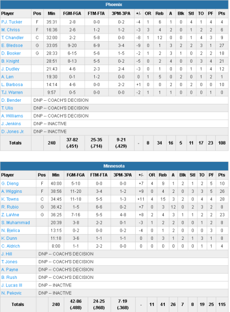 Karl-Anthony Towns, auteur d’un match énorme à Houston, a encore une fois mené les siens avec un gros double-double: 28 points à 11/18 et 15 rebonds. Il a été bien aidé par Andrew Wiggins (26 points à 11/20) et Zach LaVine (23 points à 7/16) alors que Ricky Rubio délivre lui 12 passes décisives. Auteur de 27 points à 9/20, Eric Bledsoe n’a pu éviter une 3ème défaite de rang des siens. Brandon Knight ajoute lui 21 points à 8/13 et Devin Booker 18 points à 6/15.