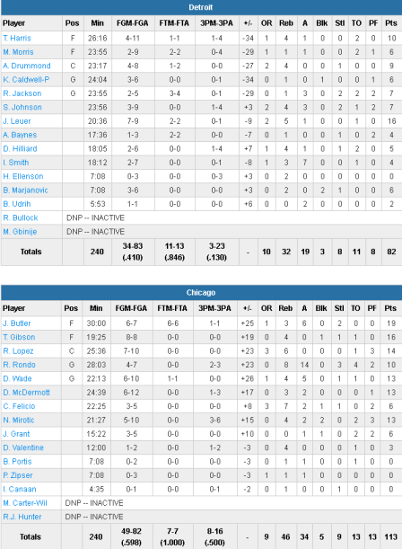 Les Bulls ont fait parler leur collectif des deux côtés du terrain en limitant Detroit à 41% tout en shootant à un impressionnant 59.8% de l’autre côté du terrain. 7 joueurs ont marqué au moins 10 points dont 19 pour Jimmy Butler à 6/7, 16 pour Taj Gibson à 8/8, 14 pour Robin Lopez et 13 pour Dwyane Wade. Rajon Rondo compile lui 10 points, 8 rebonds et 14 passes. Du côté de Detroit Jon Leuer (16 points) et Tobias Harris (10 points à 4/11) sont les seuls à atteindre les 10 points.