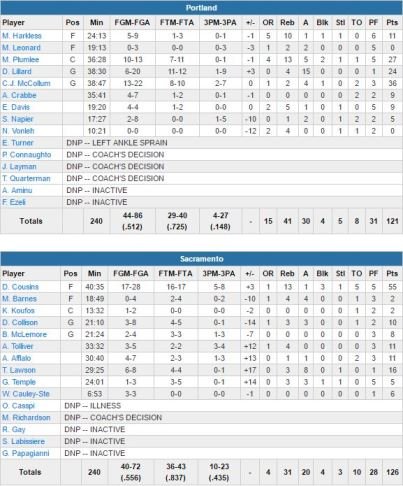 Du côté des Kings, Ty Lawson (16 points), Anthony Tolliver (11 points) et Arron Afflalo (11 points) ont épaulé Cousins en l’absence de Rudy Gay (hanche). Menés de 6 points pour débuter le 4ème quart-temps, les hommes de Dave Joerger vont passer un 17-4 à leurs adversaires pour prendre 7 points d’avance en milieu de période. Lawson donne un premier avantage aux Kings sur un shoot ligne de fond, 102-101. Cousins se charge ensuite de rentrer de maintenir 2 points d’écart sur un 3-points (119-117) avant que Plumlee n’égalise sur un dunk de l’autre côté à 46 secondes.