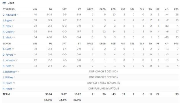 Le Jazz était encore devant de 20 points dans le 3ème quart avant que sa défense disparaisse. Gordon Hayward (28 points et 10 rebonds) a eu une occasion, en isolation face à Cousins, de remporter le match, mais sa tentative de fadeaway est trop courte à 16.6 secondes. Rudy Gobert signe son 9ème double-double d’affilée avec 17 points et 14 rebonds. Utah passe devant 62-42 au terme d’un 9-0 dans le 3ème quart-temps mais encaisse ensuite un 13-2 à cheval entre le 3ème et le 4ème quart-temps avant de complètement craquer.
