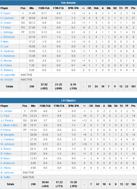 Avant de se blesser, Chris Paul avait mis la main sur le match avec 19 points à 6/11, 7 rebonds et 6 passes en seulement 23 minutes. La clé de la rencontre c’est la performance du banc des Clippers, auteur de 58 points, contre seulement 33 aux Spurs. Mo Speights a signé 14 points, Raymond Felton a brillé en relais de Chris Paul avec 13 points à 6/9 et Jamal Crawford a ajouté 11 points. 11 points c’est aussi le total de JJ Redick et DeAndre Jordan. Les purs ont livré une de leurs plus mauvaises prestations de la saison, jamais vraiment dans le match, limités à 40.2% au tir. Kawhi Leonard signe tout de même 27 points à 8/19, 9 rebonds et 5 passes tandis que Pau Gasol (19 points à 5/11 et 8 rebonds) a été le seul a sortir aussi un peu la tête de l’eau. LaMarcus Aldridge signe seulement 10 points et Tony Parker passe à côté avec 2 points à 1/8.