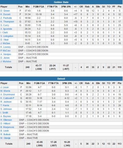 L’équipe au meilleur bilan de la ligue a rentré 56% de ses tirs et terminé à 11/27 à 3-points dans ce match, Detroit perd de son côté un 5ème match consécutif. JaVale McGee ajoute 15 points à 6/7 en seulement 8 minutes pour l’équipe de Steve Kerr ! Detroit (devant de 2 points 59-57 à la mi-temps) est porté par les 16 points de Tobias Harris (en sortie de banc pour la première fois de la saison, Jon Leuer ayant pris sa place dans le 5), les 25 points de Kentavious Caldwell-Pope, les 17 points de Reggie Jackson et les 15 points et 9 rebonds d’Andre Drummond.