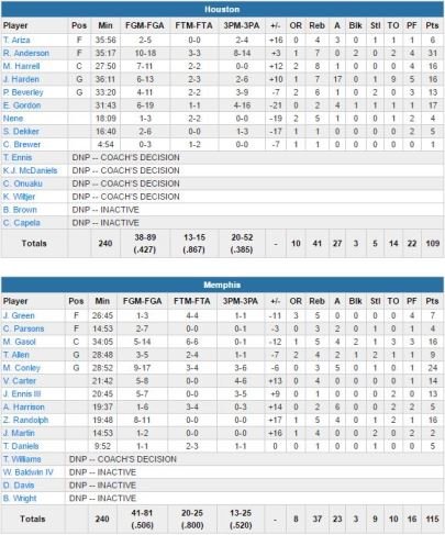 Vince Carter rentre deux 3-points durant un 10-0 en début de 4ème quart-temps et alors que Houston était devant 78-77 à l’entame de la période grâce à un 3-points de Patrick Beverley. Memphis passe un 21-5 à ses adversaires après ce dernier et se détache 98-83 sur une claquette dunk signée Jarell Martin à 6’51 du buzzer. Ryan Anderson termine meilleur marqueur de Houston avec 31 points (record en saison) alors que James Harden compile 16 points, 17 passes, 7 rebonds mais aussi 9 ballons perdus en 36 minutes.