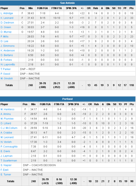 Privés de leurs vétérans Manu Ginobili, Pau Gasol et Tony Parker, les Spurs se sont appuyés sur Leonard (33 points à 9/15 dont 5/7 à 3 -pts), Patty Mills (23 points à 7/9 dont 5/7 à 3 -pts) et LaMarcus Aldridge (18 points à 7/18, 14 rebonds et 6 passes). Ils ont shooté à 50% dont un 12/20 derrière l’arc. Encore une fois en grande difficulté en défense, Portland est limité à 44.3% en attaque à l’image du duo Damian Lillard (16 points à 7/19, 5 rebonds et 10 passes) et Cj McCollum (16 points à 5/16).