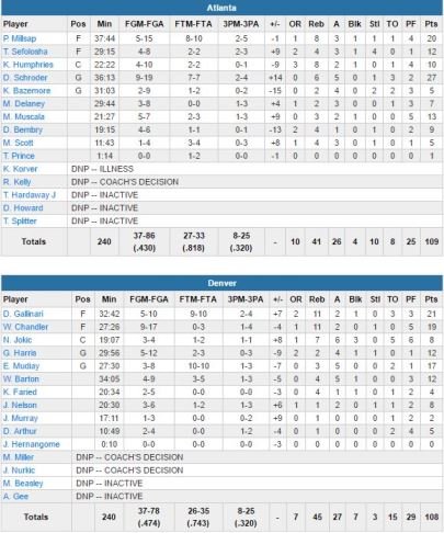 Un 9-0 conclu par 2 lancers-francs de Paul Millsap (20 points et 8 rebonds) dans la dernière 1’43 du match a permis à Atlanta de battre Denver au Pepsi Center cette nuit. Dennis Schröder ajoute 27 points alors que les Hawks jouaient sans Dwight Howard (dos) pour un 3ème match consécutif. Denver, mené par les 21 points et 11 rebonds de Danilo Gallinari, menait 108-100 avant le run décisif d’Atlanta.