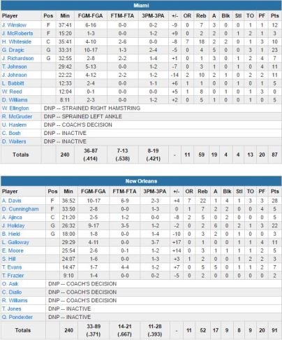 En retard de 14 points dans le 3ème quart-temps, les Pelicans l’ont emporté cette nuit face au Heat avec un 15-0 suivi d’un 12-0 en fin de match. Anthony Davis signe 28 points, 22 rebonds (record en carrière) et 4 contres, Jrue Holiday 22 points. New Orleans n’a shooté qu’à 37% mais a inscrit ses 37 derniers points dans la peinture face au Heat de Goran Dragic (23 points, 5 passes) et Hassan Whiteside (10 points, 18 rebonds).