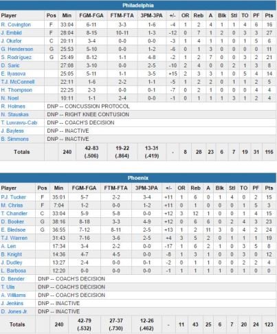 Eric Bledsoe (16 de ses 24 points dans le 4ème quart, 11 passes) et Devin Booker (23 points) ont mené les Suns à la victoire face à Philadelphie cette nuit. Joel Embiid termine à 27 points, Sergio Rodriguez 21 pour les Sixers, qui ont compté jusqu’à 14 points d’avance en 1ère mi-temps. Phoenix a ensuite pris 14 longueurs d’avance dans le 4ème avant de laisser ses adversaires recoller à 4 points dans les dernières secondes.