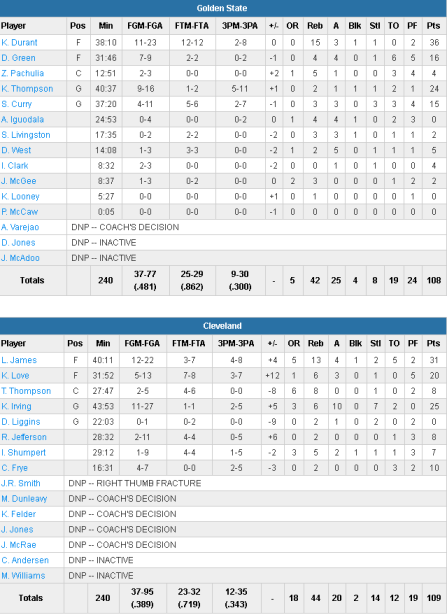 Les Cavaliers ont été menés quasiment tout le match et ils comptaient 14 points de retard dans le dernier quart avant que le héros du jour, Kyrie Irving prenne les choses en main. Le meneur a tout fait aux Warriors et ramené les siens en fin de rencontre. C’est lui qui a réduit le score à un point puis marqué derrière le panier de la gagne. Il termine avec 25 points dont 14 dans le dernier acte à 11/27, 6 rebonds, 10 passes et 7 interceptions. LeBron James sort aussi un gros match avec 31 points à 12/22, 13 rebonds et 4 passes. Kevin Love ajoute 20 points et 6 rebonds. A noter aussi les 8 points de Richard Jefferson, très précieux.