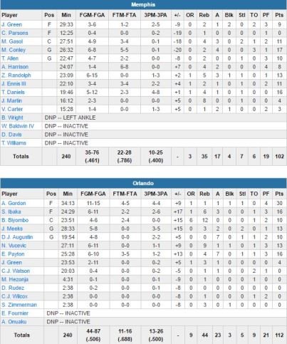 Mike Conley termine meilleur marqueur de Memphis avec 17 points, Troy Daniels suit avec 16 unités et Zach Randolph 13 mais les Grizzlies n’ont jamais pu se remettre du retard accumulé en début de match. Plus tôt dans la saison, Orlando avait gâché une avance de 14 points dans les 6 dernières minutes pour finalement perdre 95-94 à Memphis. Cette fois, l’équipe de Frank Vogel était devant de 25 points à la mi-temps avant de céder un peu de terrain à 3’15 de la fin et avant un 3-points de Gordon, 109-94. Jodie Meeks (à 2/13 à 3-points sur ses 5 précédents matchs, il rentre ses 5 premiers shoots dont 3 trois-points) Payton et Biyombo combinent pour 28 points à 10/12 en 1ère mi-temps. Le Magic (57.8% de réussite contre la 2ème meilleure défense NBA) se détache à l’aide d’un 12-0 en milieu de 2ème quart pour faire monter l’écart jusqu’à 26 points.