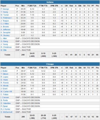 Après 30 secondes de jeu dans le dernier quart, les Pacers égalisent à 64 partout sur un 3-points de Brooks. Chicago répond avec un 10-0 pour mener 74-64. En milieu de période, Indiana signe 8 points d’affilée pour revenir à 76-74 puis 86-15 dans la dernière minute sur un 3-points de Paul George. Mais Mirotic sur un long 2-points à 21.2 secondes puis Wade avec une interception et le panier qui s’en suit tuent le match.