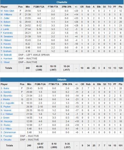 Les Hornets laissent Orlando shooter à 59% en 1ère mi-temps mais va verrouiller la défense après la mi-temps. Six joueurs vont marquer pour Charlotte sur 6 minutes en milieu de période pour un 28-2. Pendant ce temps, le Magic a shooté à 1/11 et perdu 4 ballons, tombant à 92-61.