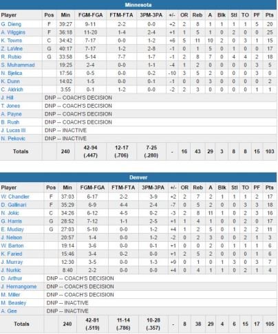 Danilo Gallinari (18 points) a aussi été clutch avec un panier important à 27 secondes de la fin. Nikola Jokic termine lui à 2 rebonds d’un triple-double avec 16 points, 8 rebonds et 11 passes. Andrew Wiggins signe 25 points pour les Wolves, Gorgui Dieng 20. Leur équipe mène de 13 points en début de match mais Denver répond en dominant Minnesota de 9 points dans le 2ème quart. Wiggins, qui marque 20 points en 1ère mi-temps, rentre un shoot à 3-points avec la planche avant la mi-temps et son équipe revient à égalité 49 partout à la pause.