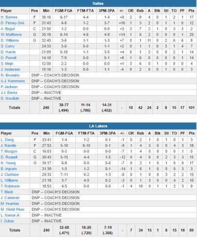 Dallas a remporté cette nuit au Staples Center sa 12ème victoire consécutive sur les Lakers, 101-89. Wesley Matthews termine meilleur marqueur des Mavs avec 20 points à 6/14 et 6 rebonds, Harrison Barnes ajoute 17 points à 6/17, 9 rebonds et 4 passes alors que Dwight Powell et Devin Harris signent tous deux 14 points. Dignes de leur spécialité maison actuellement, les Lakers ont laissé filer le match après avoir mené de 11 points.