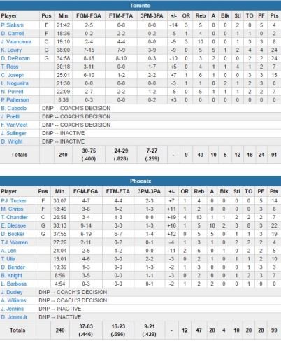 Phoenix démarre sur un 12-4 en limitant ses adversaires à 1/10 aux tirs. Toronto revient via un 14-4 sur les 5 dernières minutes du 1er quart et mène finalement 18-16 après 12 minutes de jeu et malgré un 6/18. Les Suns vont prendre jusqu’à 5 points d’avance dans le 2ème mais ne compteront que 2 points d’avance à la pause, 42-40. Ils prennent ensuite 12 points d’avance dans le 3ème quart, puis 72-58 à 46 secondes de la fin de la période et 76-62 au buzzer de cette dernière.