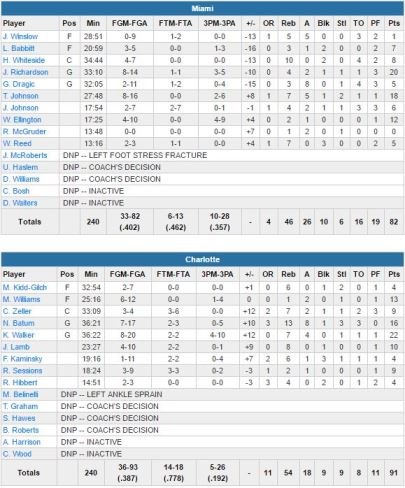 À nouveau excellents dans le 3ème quart-temps hier, les Hornets ont battu Miami 91-82. Nicolas Batum signe 16 points à 7/17, 13 rebonds et 8 passes dont 9 points, 5 rebonds et 4 passes dans la 3ème période, remportée 31-17 par Charlotte.