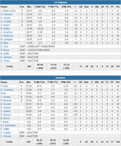 Harden signe là son 7ème triple-double de la saison et son 3ème match consécutif à au moins 30 points. Montrezl Harrell bat lui son record en carrière avec 29 points alors que côté Clippers, Raymond Felton bat son record en saison avec 26 points. Devant de jusqu’à 25 points, les Rockets vont se relâcher et laisser leurs adversaires revenir à 6 points en début de 4ème quart-temps avant de leur passer un 13-0 pour passer à 126-104 à 7 minutes de la fin. Harrell marque 6 points durant ce run et les Clippers sont privés de points pendant plus de 4 minutes.
