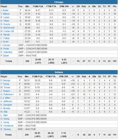 À noter : malgré 7 turnovers dans le 1er quart, Chicago (6/23 à 3-points) n’était mené que de 6 points 28-22 à la fin de la période. Wade a quitté le match à 7’28 de la fin sur une apparente blessure au poignet gauche après une chute et est revenu à 4’07. Indiana a battu son record de points en 1ère mi-temps sur la saison avec 62 (62-50). Glenn Robinson III a signé 12 points et 10 rebonds. Rajon Rondo a pris 2 fautes en 7 minutes.
