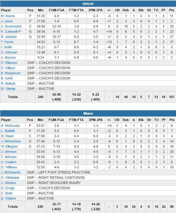 Miami, qui perd là un 5ème match consécutif, a pourtant démarré son match sur un parfait 8/8 et scoré 66 points en 1ère mi-temps. L’équipe sera néanmoins limitée à 39% aux tirs sur le reste du match et seulement 32 points marqués après la pause. Le Heat marque 15 points dans le 3ème quart-temps et 0 durant les 5 premières minutes du 4ème. Detroit prend les commandes au terme d’un 27-8 durant un run qui a duré plus de 8 minutes.