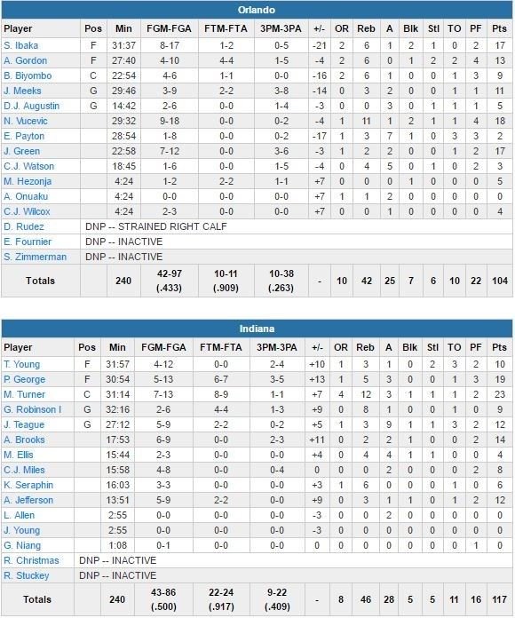 En l’absence d’Evan Fournier (talon droit), Nikola Vucevic termine à 18 points et 11 rebonds et Jeff Green et et Serge Ibaka inscrivent chacun 17 points pour le Magic. Revenu à 6 points à 36 secondes de la mi-temps sur un 3-points de Jodie Meeks, Orlando encaisse un 3-points d’Aaron Brooks et Indiana rentre au vestiaire en tête 62-51. L’écart se maintient dans le 3ème (74-56 à 8’30) avant que le Magic ne recolle à 9 points en début de 4ème. Mais les Pacers répondent dans la foulée par Brooks et Al Jefferson, dont le dunk à 8’51 rétablit un écart de 15 points, 95-80.