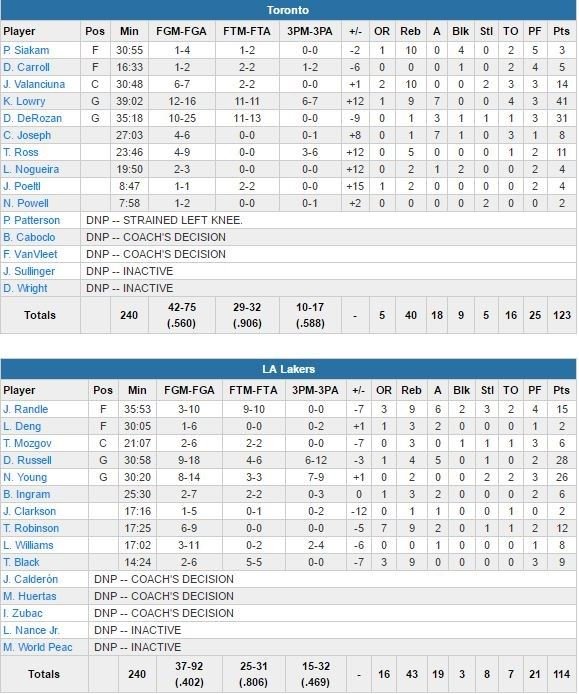 Après un premier quart équilibré, les Lakers avaient réussi à faire le break en second sous l’impulsion d’un 15-3 (42-30) mais DeRozan et Lowry ont ramené les Canadiens avant la pause, 57-57 Toronto. Le chassé croisé s’est poursuivi en 3ème acte et il a fallu attendre le dernier quart pour que la rencontre bascule définitivement en faveur des visiteurs. Grâce à leurs arrières Cory Joseph et Kyle Lowry, Toronto a entamé les 12 dernières minutes par un 22-3 fatal pour filer tranquillement vers la victoire.