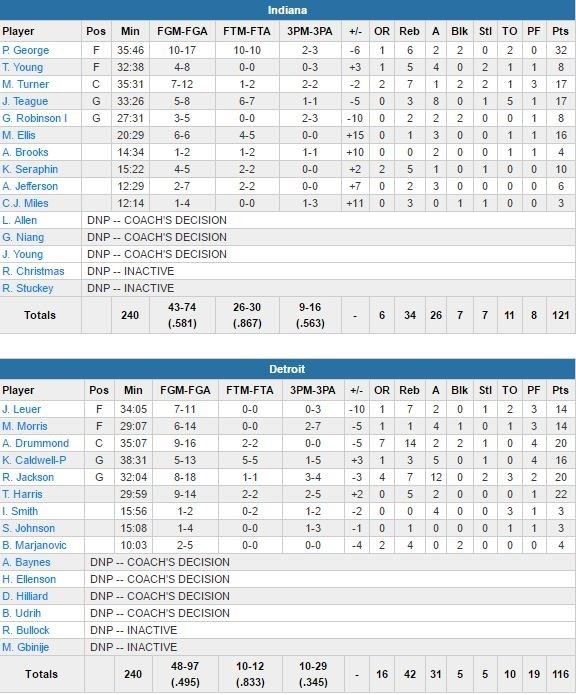 Les Pacers (59% aux tirs, 88% à 3-points et 93% aux lancers-francs en 1ère mi-temps) battent leur record de points dans un 1er quart-temps cette saison avec 36 unités grâce à un 6/7 à 3-points pour commencer le match. L’écart passe à 15 points dans le 2ème avant que Detroit ne revienne à 66-60. Jackson en début de 3ème ramène les siens à 73-72 et provoque un temps-mort de Nate McMillan. Il sert ensuite Drummond sur alley oop pour égaliser à 77 partout, et les deux équipes restent à égalité 92 partout avant de jouer le dernier quart.