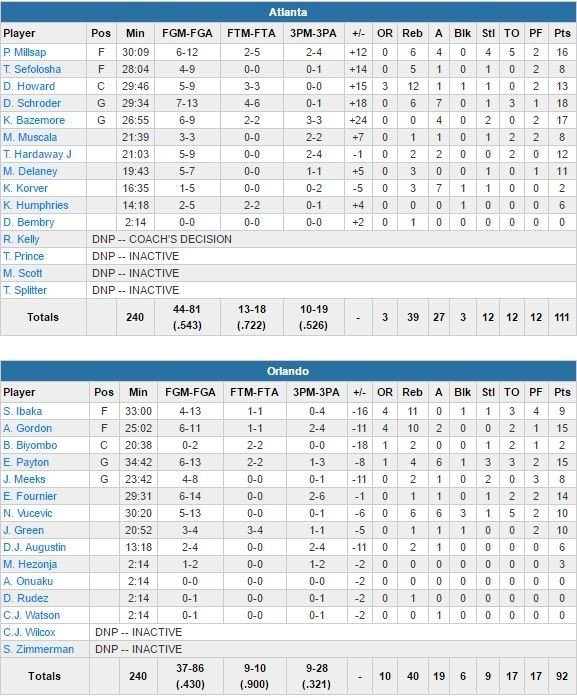 Les deux équipes combinent pour 20 ballons perdus dans une 1ère mi-temps serrée mais déjà dominée par les Hawks à la pause (52-47) grâce à 22 points inscrits dans la peinture. Atlanta (54% de réussite aux tirs et 53% à 3-points) est devant de 15 points après 3 quarts-temps, mais Orlando passe un 14-2 pour revenir à 88-84 à 7’56. Les Hawks répondent avec un 21-5 pour mettre le match hors de portée.