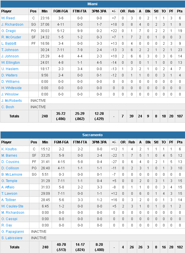 Johnson termine meilleur marqueur de la rencontre avec 23 points à 7/19 et 6 rebonds alors que Goran Dragic marque 19 points et délivre 7 passes. James Johnson et Wayne Ellington sont précieux en sortie de banc avec respectivement 14 et 13 points. En face DeMarcus Cousins signe un de ses pires matchs de la saison malgré l’absence d‘Hassan Whiteside. Le pivot marque 13 points à 4/15. Les meilleurs marqueurs des Californiens sont 3 remplaçants puisque Garrett Temple, Arron Afflalo et Ty Lawson inscrivent 15 points chacun. Sacramento shoote à 51.3% sur la rencontre mais perd 16 ballons et ne capte que 4 rebonds offensifs. Le Heat compense une adresse légèrement inférieure avec un 12/28 derrière l’arc et 25 lancers francs réussis.
