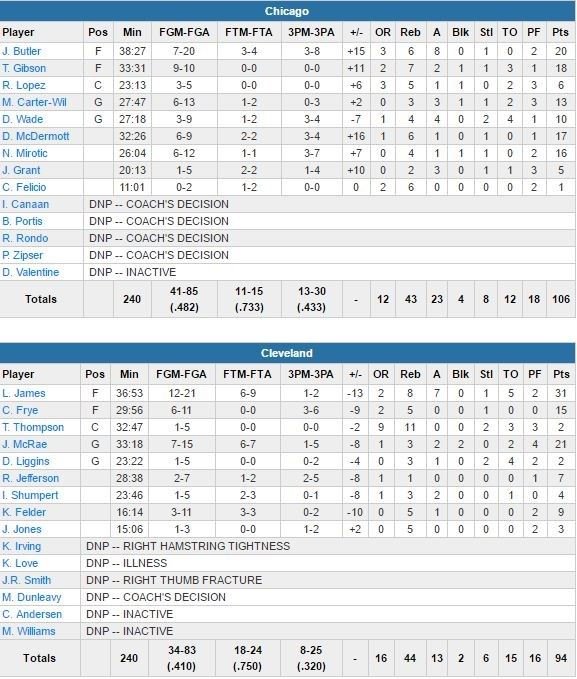 Butler (52 points contre Charlotte lors du match précédent) a pris les commandes dans le 4ème quart-temps avec 10 points consécutifs durant un run décisif et 14 de ses 20 points dans les 12 dernières minutes. Chicago bat son record de 3-points inscrits dans un match cette saison avec 13 (Butler, Dwyane Wade, Doug McDermott et Nikola Mirotic en rentrent chacun 3). L’équipe met du temps à trouver la mire et shoote à seulement 1/8 de loin dans le 1er quart. Ils rentrent ensuite 11 de leurs 14 tentatives suivantes et prennent 15 points d’avance lorsque James rejoint le banc à 3’30 de la fin du 3ème quart. Le banc de Cleveland a néanmoins réduit l’écart à 4 points au retour de la star sur le parquet de la Quicken Loans Arena.