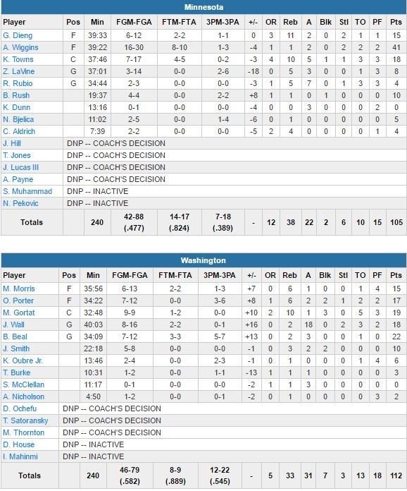 Les Wizards répondent par un 9-0 d’entrée de jeu dans le 4ème pour reprendre la tête 89-85. Il faudra ensuite attendre qu’il reste 2’50 à jouer pour voir Minnesota revenir à 101-99 grâce à Wiggins. Otto Porter Jr égalise et Wall enchaîne deux layups sur contre-attaques pour le +4, 105-101 à 1’40. Wiggins enchaîne dunk puis jump shot mais à chaque fois, les Wizards ont la réponse et comptent toujours 5 points d’avance à 48 secondes après avoir scoré sur 5 possessions consécutives. Les derniers points de la rencontre seront marqués par Wall aux lancers-francs à 8.3 secondes (2/2).