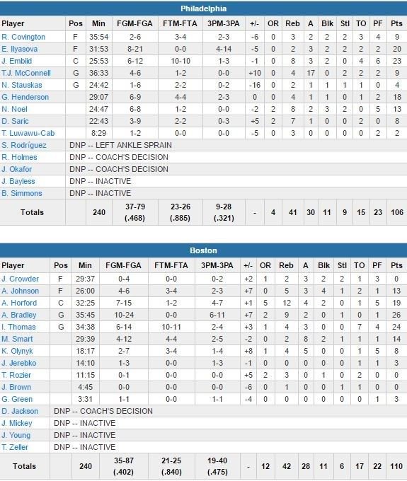 Joel Embiid (limité à 25 minutes car grippé) termine lui à 23 points à 6/12 et 10/10 aux lancers-francs, 8 rebonds, 3 passes et 2 contres, Ersan Ilyasova à 20 points à 8/21 et T.J. McConnell à 9 points et 17 passes pour une équipe de Philadelphie qui a pris jusqu’à 14 points d’avance en 1ère mi-temps avant de se faire rejoindre par les Celtics en début de 4ème quart. Embiid inscrit 17 points en 1ère mi-temps et par moment, le TD Garden s’est même mis à chanter « Trust The Process » en son honneur ! Les Sixers font un énorme 2ème quart (39-26) dans lequel Boston est limité à 7/22.