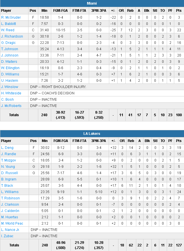 Il ont été menés par Lou Williams (24 points à 9/19), Luol Deng (19 points et 14 rebonds) et D’Angelo Russell (19 points, 6 rebonds et 5 passes). Pas moins de 6 joueurs marquent au moins 10 points pour les Californiens, qui shootent à 50% et captent 62 rebonds, dont 18 offensifs. Il faut dire que les Floridiens n’ont rentré que 41.3% de leurs tentatives. Ces derniers étaient sans Hassan Whiteside et les deux meilleurs joueurs ont été Goran Dragic (16 points) et Willie Reed (22 points et 12 rebonds).