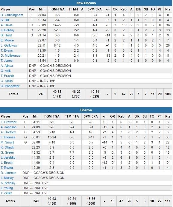 À noter : Donatas Motiejunas a joué son premier match de la saison et termine à 11 points et 5 rebonds en 20 minutes pour New Orleans. Boston a rentré 18 trois-points et signe un 4ème match consécutif à au moins 17 tirs primés.