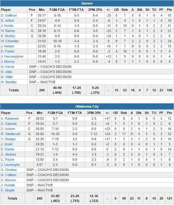Steven Adams ajoute 16 points, 6 rebonds et 4 contres, Victor Oladipo 15 points pour le Thunder. En face Wilson Chandler signe 24 points et Will Barton 21 alors que Danilo Gallinari, meilleur scoreur de Denver (5ème défaite d’affilée), est limité à 15 points à 5/18. Depuis 5 matchs, les Nuggets (33.3% de réussite dans le 1er quart-temps) encaissent au moins 120 points dans chacune de leur rencontre.