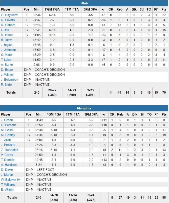 Victorieux des Warriors vendredi, les Grizzlies n’ont pas levé le pied cette nuit en dominant Utah 88-79, portés par son trio Mike Conley (19 points à 8/18 et 9 passes), Marc Gasol (17 points à 7/18 et 4 rebonds) et Zach Randolph (13 points à 6/16 et 11 rebonds).
